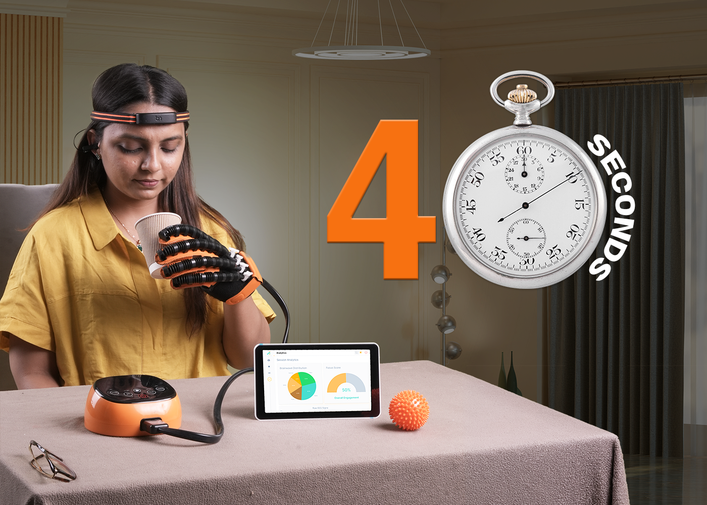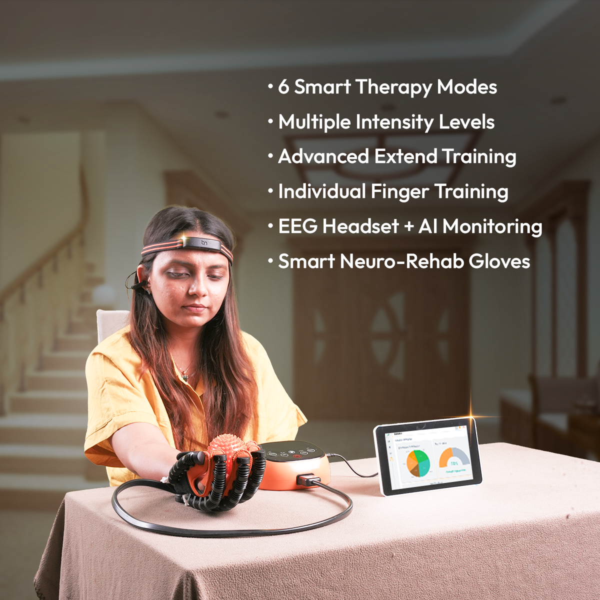 It combines our full RehabVeda Neuro-Glove Device, AI-based neurofeedback