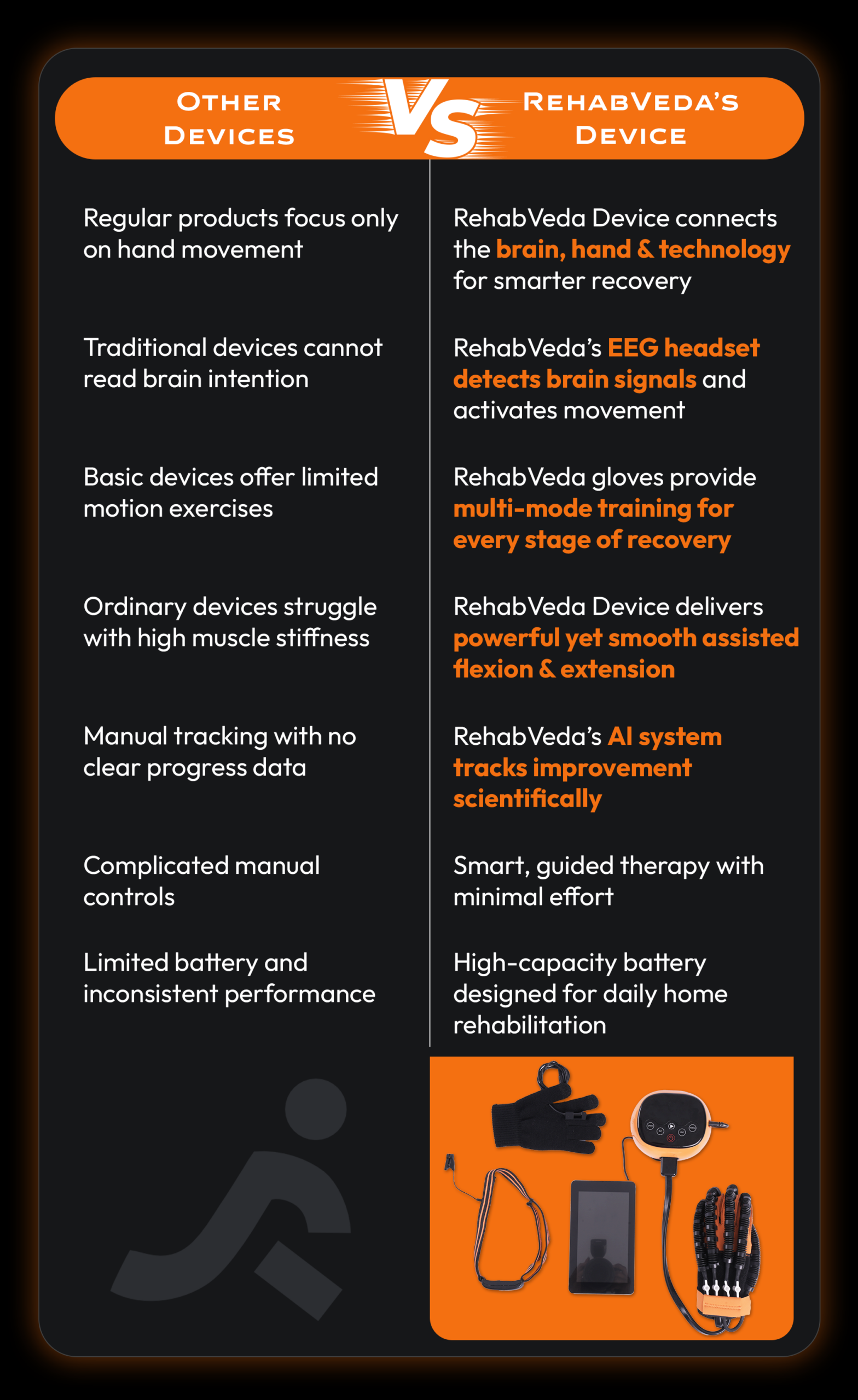 ✨ Powered by brain-signal detection, AI-based tracking, and smart rehab gloves, RehabVeda Device guides recovery through every stage — helping patients move toward confidence and independence again.
